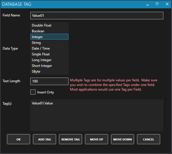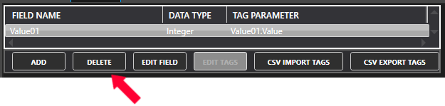Add a data field and specify the Tag Parameter, field name, and field data type use the Add Button.