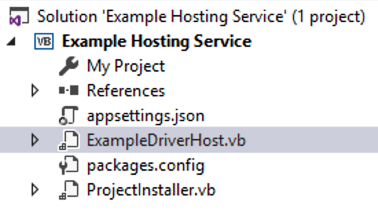 Copy the C# or VB Hosting App Code from the OAS installation path, typically C:\Program Files\Open Automation Software\OAS\Universal Drivers\Framework4\Hosting App\. Locate the Windows Service directory and copy to a location of your choosing, then open the project in Visual Studio. We suggest copying to a directory near the Driver source code you created in the previous tutorial as you will be referencing it.