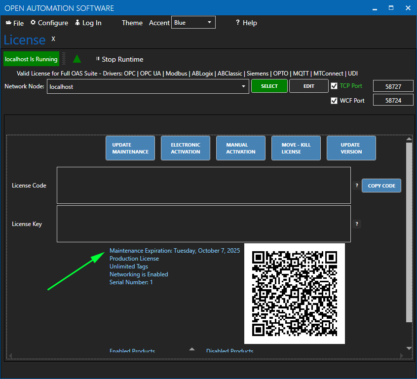 If it is current you can proceed with the update. If the maintenance is expired click on the UPDATE MAINTENANCE button and check the Maintenance Expiration again. If expired copy the License Code found under Configure-License and email to support@oasiot.com to receive an updated License Key.